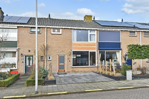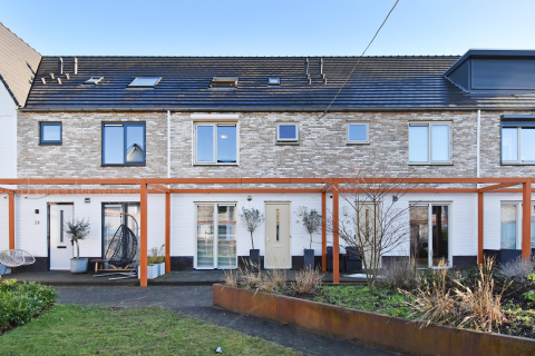 Indeling: Begane grond: Entree/hal met vaste kast voorzien van Nibe warmtepomp. Meterkast (12 groepen, 4x aardlekschakelaar en hoofdschakelaar). Geheel betegelde moderne toiletruimte met hangend toilet en fonteintje. Tuingerichte uitgebouwde woonkamer met trapkast (voorzien van 240 liter boiler), elektrische haard geïntegreerd in televisiekast en toegang middels openslaande deuren tot de achtertuin. Open keuken met L-vormige moderne lichte keukenopstelling met antraciet composiet blad en verder voorzien van spoelunit, Quooker, inductie kookplaat, recirculatiekap en vaatwasmachine. Tegenover de keukenopstelling staat een kastenwand voorzien van grote koelkast met vitafrech lade, grote vrieskast, oven en magnetron.